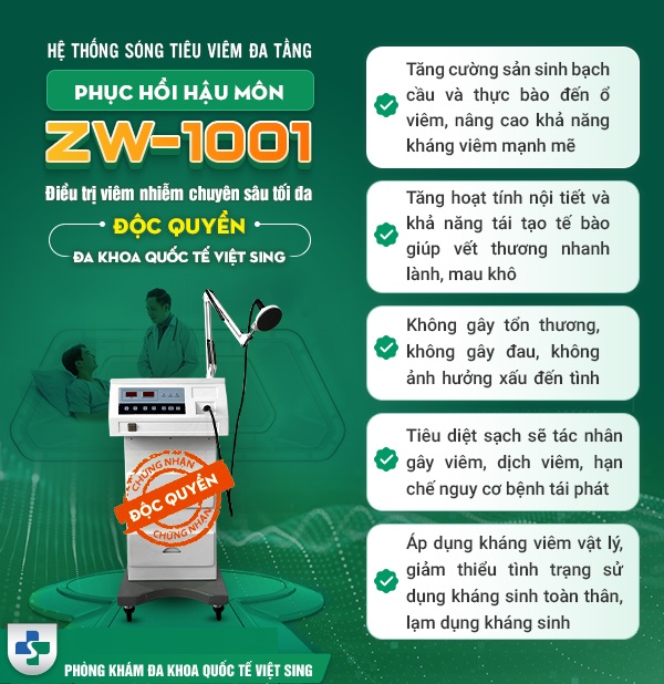 Công nghệ tiên tiến: Ứng dụng phương pháp sóng cao tần ITC hiện đại trong điều trị bệnh trĩ, giúp giảm đau, ít xâm lấn, phục hồi nhanh. Đặc biệt, ĐỘC QUYỀN công nghệ phục hồi hậu môn sau cắt trĩ bằng hệ thống sóng tiêu viêm đa tầng ZW-1001.