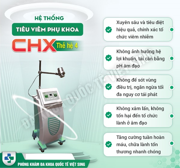 Phương pháp tiêu viêm phụ khoa CHX đời thứ 4 được ứng dụng trong hỗ trợ điều trị viêm tuyến Bartholin mang lại hiệu quả vượt trội. Công nghệ này giúp tiêu viêm trực tiếp tại chỗ từ sâu bên trong ổ viêm, làm sạch vùng âm đạo, loại bỏ nhanh các tác nhân gây bệnh và giảm sưng đau rõ rệt ngay từ lần đầu thực hiện, không cần lạm dụng kháng sinh toàn thân.